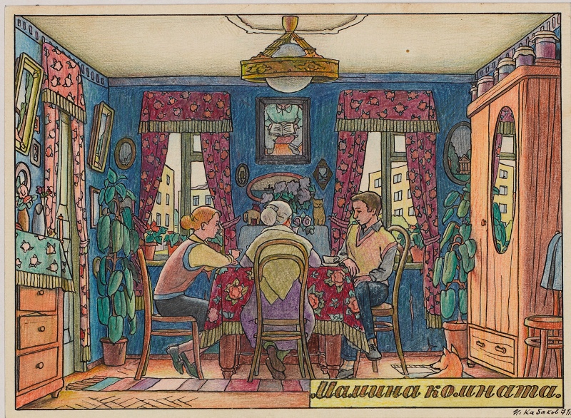 Ilya Kabakov, "Mum's room" from Sitting-in-the-Closet Primakov, Album 1 of Ten Characters, 1971-74. Forty-seven sheets, india ink and colored pencil on paper mounted on gray paper. Centre Pompidou, Paris. National Museum of Modern Art – Center for Industrial Creation, Gift of the artist through the Cultural Services of the French Embassy in Moscow, 1987. © Photo © Centre Pompidou, MNAM-CCI, Dist. RMN-Grand Palais / Philippe Migeat