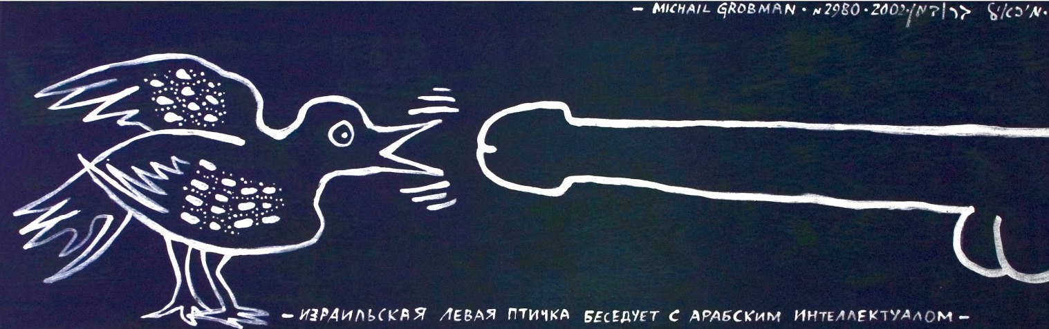 - Достойное тому подтверждение – ваша работа 2002 года «Израильская левая птичка беседует с арабским интеллектуалом», где довольно милая птичка чирикает что-то «на ушко» огромному фаллосу… Иначе, вы довольно четко обозначаете свою гражданскую позицию. Да и политическую тоже.