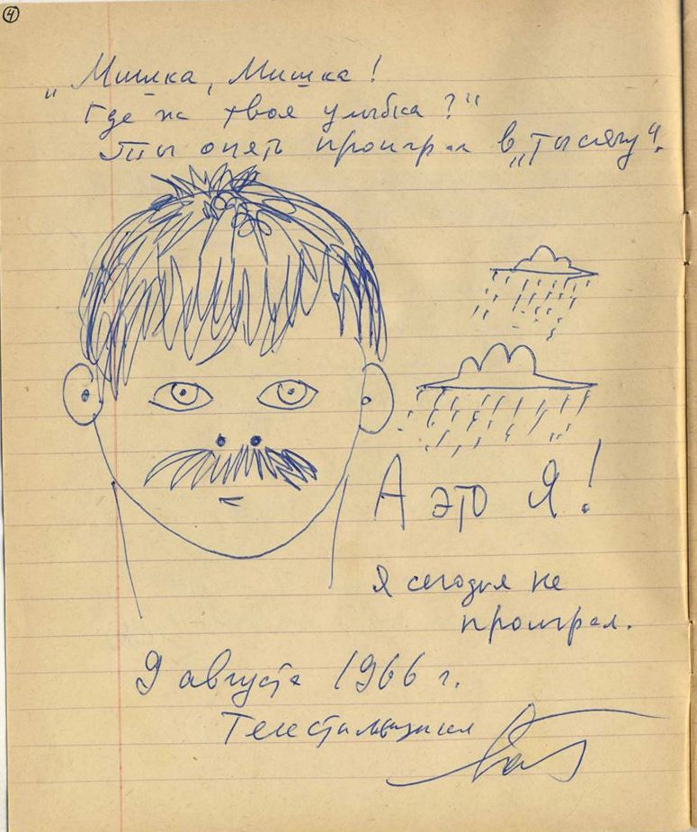 - В тетрадях рисовали все художники нашего круга, поэты, писатели… Там есть фантастические вещи. К примеру, запись Игоря Бахтерева – единственного уцелевшего обэриута. Он был у нас и написал в тетрадке стихотворение: «ты спросила: «Сколько время?» Я ответил: «Белый стол».