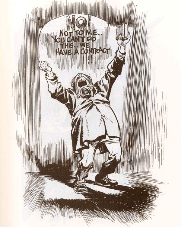 Танахическая тема богоизбранности, а также ответственности, которую она налагает на избранного, представлена на выставке через образ Авраама. Согласно Библии, Авраам – первый герой, избранный Б-гом – готов принести в жертву своего единственного сына, и эта дилемма между отцовской любовью и долгом наиболее ярко отражена в первом графическом (и отчасти автобиографическом) романе Уилла Айснера «Контракт с Богом», опубликованном в 1978 году, после смерти его шестнадцатилетней дочери. Герой первой части романа – хасид Фримме Херш – казалось бы, полный антипод праотца нашего Авраама. Еврейский иммигрант из Восточной Европы, обретающийся в Нью-Йорке начала 20 века, снимает квартирку в Бронксе и живет простой жизнью, посвящая ее Б-гу. Но когда удочеренная им девочка Ракеле умирает он внезапной болезни, Херш приходит в бешенство и обвиняет Б-га в нарушении контракта. Он отказывается от веры, бреет бороду, ворочает бизнесом, живет во грехе с нееврейкой и т.д. Сам Айснер тоже умудрился отхватить пальму первенства, начертав на обложке «Контракта с Богом» два простых слова: «графический роман». И хотя длинные истории в картинках рисовали и до него, многие стали приписывать Уиллу Айснеру рождение нового жанра. Так или иначе, именно его именем названа самая престижная премия в комикс-индустрии Америки.