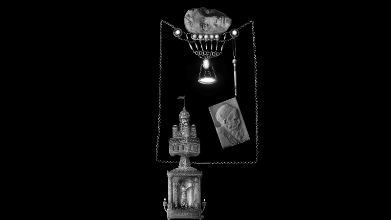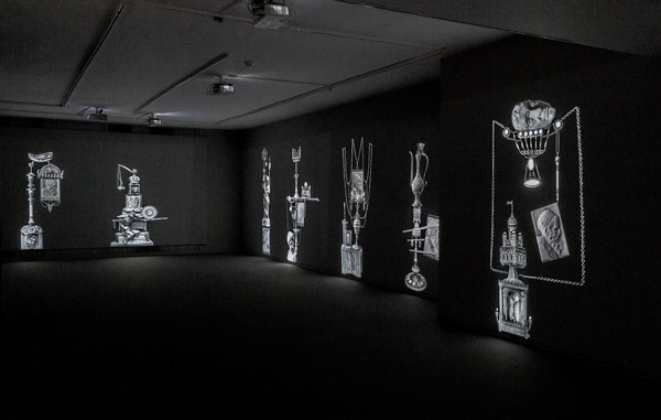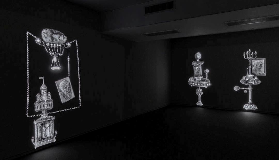 The two large-scale, immersive installations that constitute “Permanent Exhibition” encompass the two opposing display modes employed by the Bezalel museum. The first, on the CCA’s ground floor, revives the eclecticism of the display in its very first years, deploying a mix of original, reconstructed and fake artifacts along with a group of animated video works that are hung in-between: decorated rugs, tableware, portraiture and paintings that typify Bezalel’s iconographic repertoire, transporting us to its unique atmosphere – not without intended anachronisms and disturbances.
