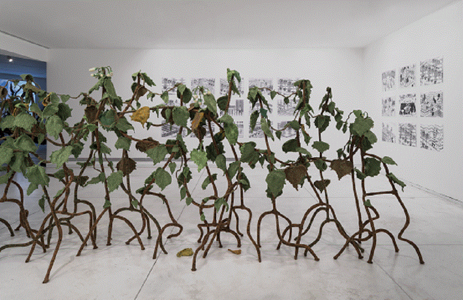 The exhibition narratives intertwine through the motif of cultivated nature. Thus, the installation Hedgerow, based on a 1943 letter in which the commandant of Auschwitz extermination camp ordered the director of the SS agricultural branch to obtain bushes, shrubs and trees that would serve as natural camouflage to hide the crematoriums. The installation simulates a live wall that acts as an architectural screen in the exhibition space. The piece was made by Yefman and the women of Kuchinate collective who held public knitting circles at Tel Aviv museum of Art. 265 volunteers who answered an open call took part in crocheting woolen leaves into a knitted hedgerow. The mute nature allows Yefman to transform the building blocks of Israeli society, to pick at the wounds of memory, to gaze at them with eyes wide open and to plant new seeds in them.