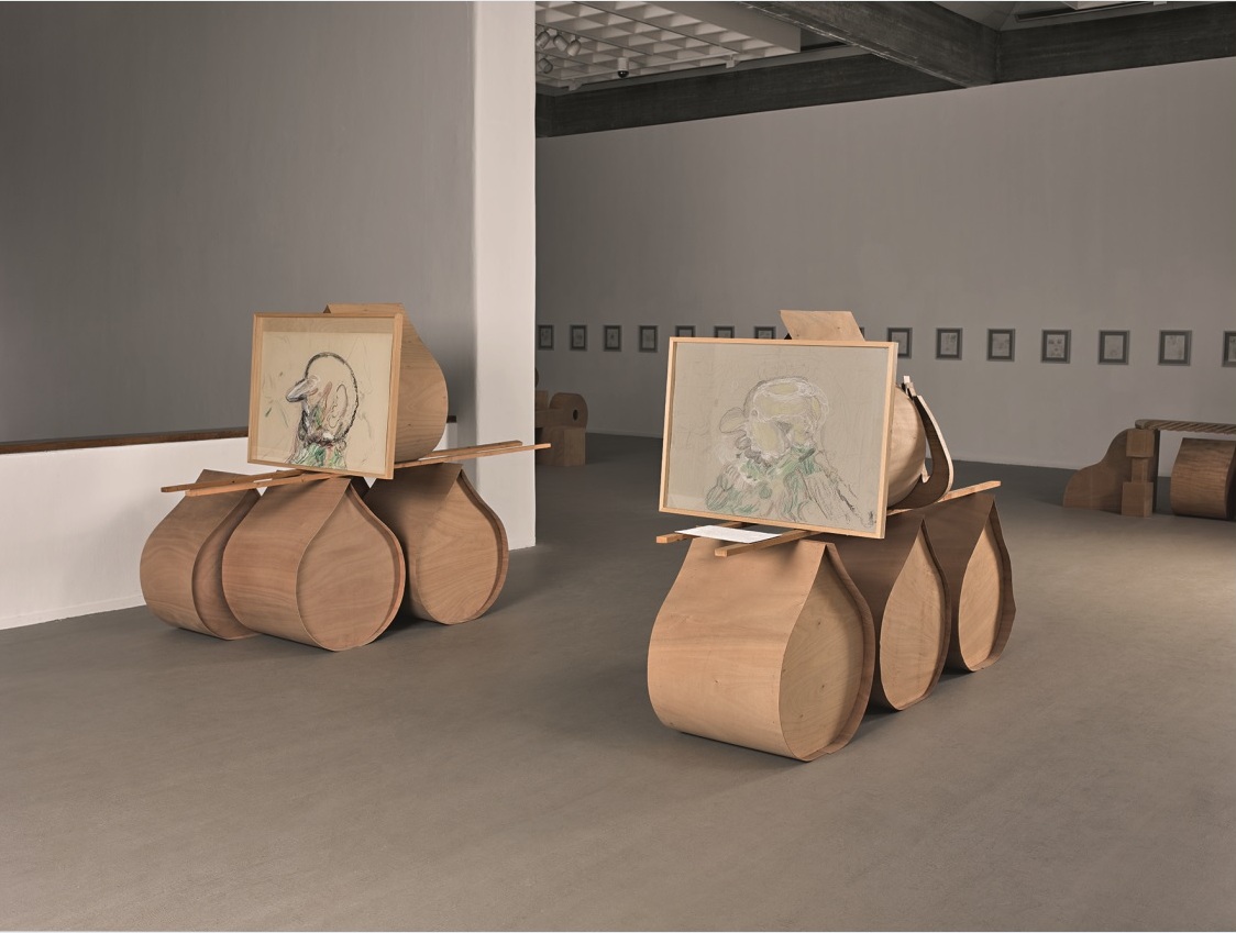 During the late 1980s and throughout the 1990s, Golombek made voluminous sculptural systems of banal objects identified with the status of refugees or immigrants, such as: keys, combs and belts, signatures, razor blades and toilet rolls, drops (or tears), tents, burnt matches and folding mattresses. These sculptures were interpreted in relation to Golombek’s biography: his family had immigrated from Poland in 1965, when he was a child, and settled in the development town of Or Akiva. This process continued in the Carriages (2011) sculptures, in which drops bear chalk drawings of Golombek’s father, who had died some years earlier.The empty sculptures are the rigid envelope of the vulnerable emotional state, and they enable the option of a further metamorphosis.