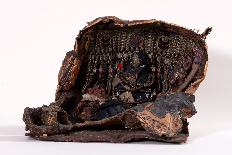 Poran’s work places a female image at its center. This image represents the multiple facets of the artist as woman, painter, solitary, introverted, tough, terrified, fragile, believer, strong, bounded to the ground and floating in childhood dreams. Poran takes control over the dissonance of contradiction by fusing them together. Every element in the form of a string, photo, shred of leather, brush, embroidery or shell forms a layer in the formation of the personage, thus she manages to create a powerful whole filled with details defining her being.