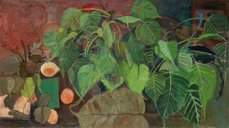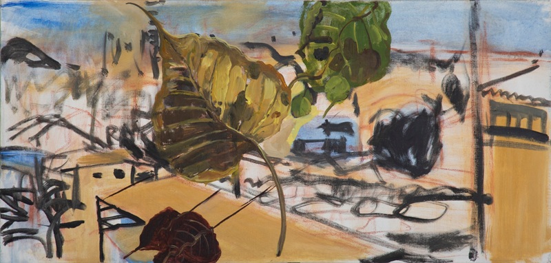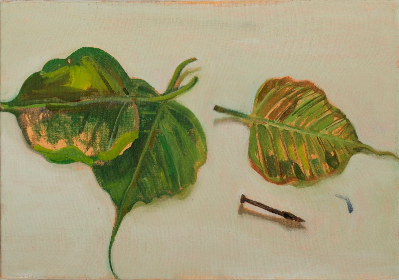 This is the sequel in the topic to which Goldman keeps returning – minute scenes, supposedly marginal, from nature, are brought into the studio, and are drawn under a northern light detached from their growth origin. Goldman directs the leaf, the leaves and the branch of the Ficus like "Ora’s Bouquet", "Lemon Grass" and "Geranium" – her previous series. Only this time a surprising, exciting twist is added. When Goldman paints a gigantic heart-like leaf, complete with veins and lobes, precise and translucent, covering up a previous painting that has lost favor in her eyes, she realizes the essence of the Buddhist idea that all phenomena are fleeting. Renouncing the punctiliousness, sensitivity, colorfulness and potency that were present in the original image, leaving them showing under a brown autumnal leaf collected from the street, creating a new image, potent and surprising. The metamorphosis of a painting.