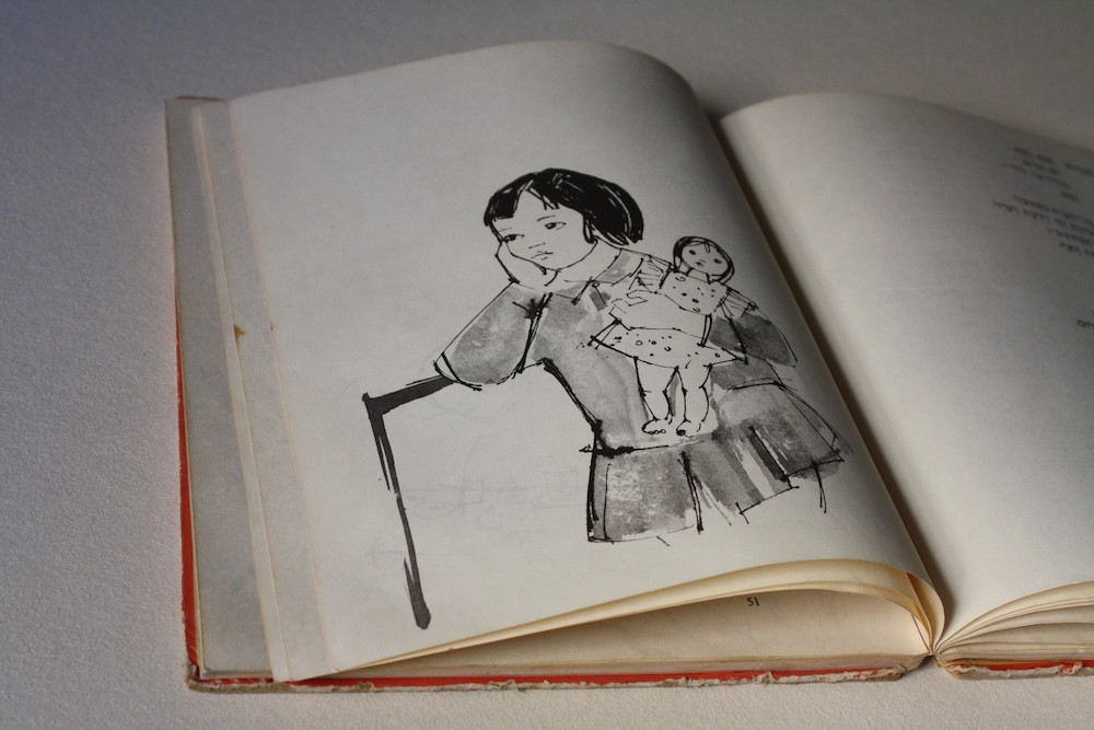 How does Tzila do it? How does one enter the books? Let us look at Tzila’s illustration for the inner lining of Cheerful Eyes by Fania Bergstein. The lining paper, painted and glued to the cover on the inside, both at the beginning and the end of the hardcovered book, is called Forzatz, from the German word Vorsatz, meaning: purpose, goal, reason; and there lies the idea that Forzatz placed in the beginning of the book stands as a compass guiding the way into the book. Forzatzes are like decks of ships, the decks of books. Journeys begin on deck. In order to embark on a journey in Tzila’s wake, in order to decipher the fashion of her lines, one can seemingly just open the books, observe the illustrations and analyze them - but the deep, true discoveries will occur in the flow from the original materials, to the fashion in which they appear in the books, alongside discoveries I’ve had along the way. Let me tell you about it here: in the artists bequest, resting in the Kipp Center for Hebrew Literature and Culture in Tel Aviv University, in the vastness of her work, lie the original illustrations for the book I Have a Secret by Miriam Yalan-Stekelis. But what I thought I'd find solely in the lines - Tzila’s soft and determined ones - turns out to be beyond them. Tzila drew quite the amount of illustrations featuring young girls enthralled in whatever they were doing - reading, drawing, writing or sleeping - in that matter, all these are self-portraits of Tzila, deeply concentrated while drawing (sometimes these are also portraits of the reading and observing child). In The Girl Meelik, Tzila doesn’t only sketch the ill-sleeping-dreaming girl to fit the poem - she also places her sketch in such a manner that the character pulls-directs-leads the turn to the next page.