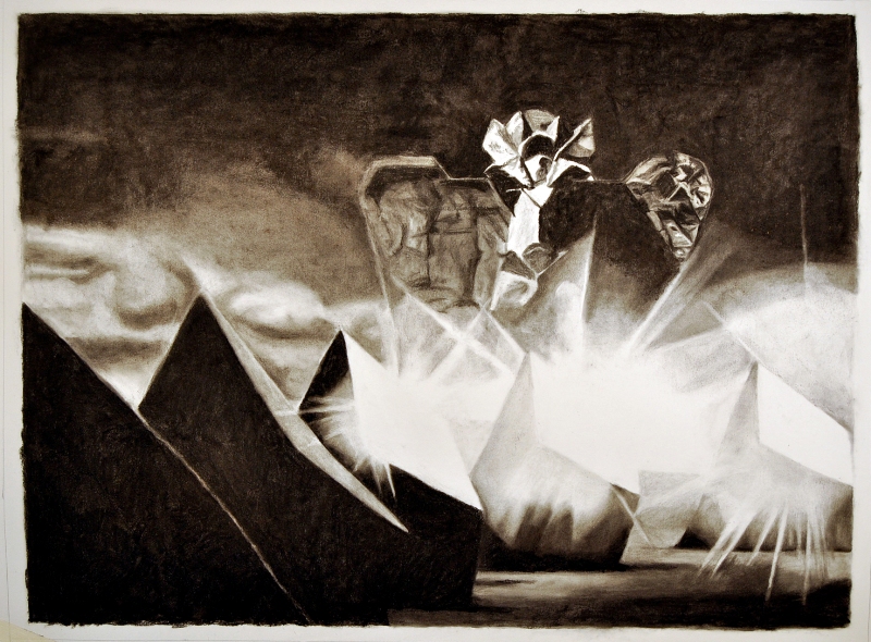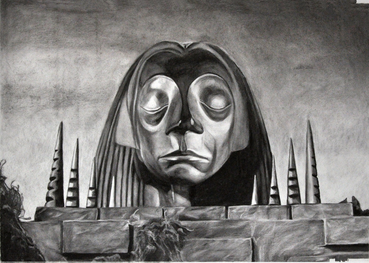 The exhibition also presents large-scale charcoal drawings fusing historical monuments, sculptures and architectural motifs with elements from science-fiction films. The drawings propose a hybrid reality born from the dark side of collective dreams and evoke in the viewer a sense of mystery and awe.