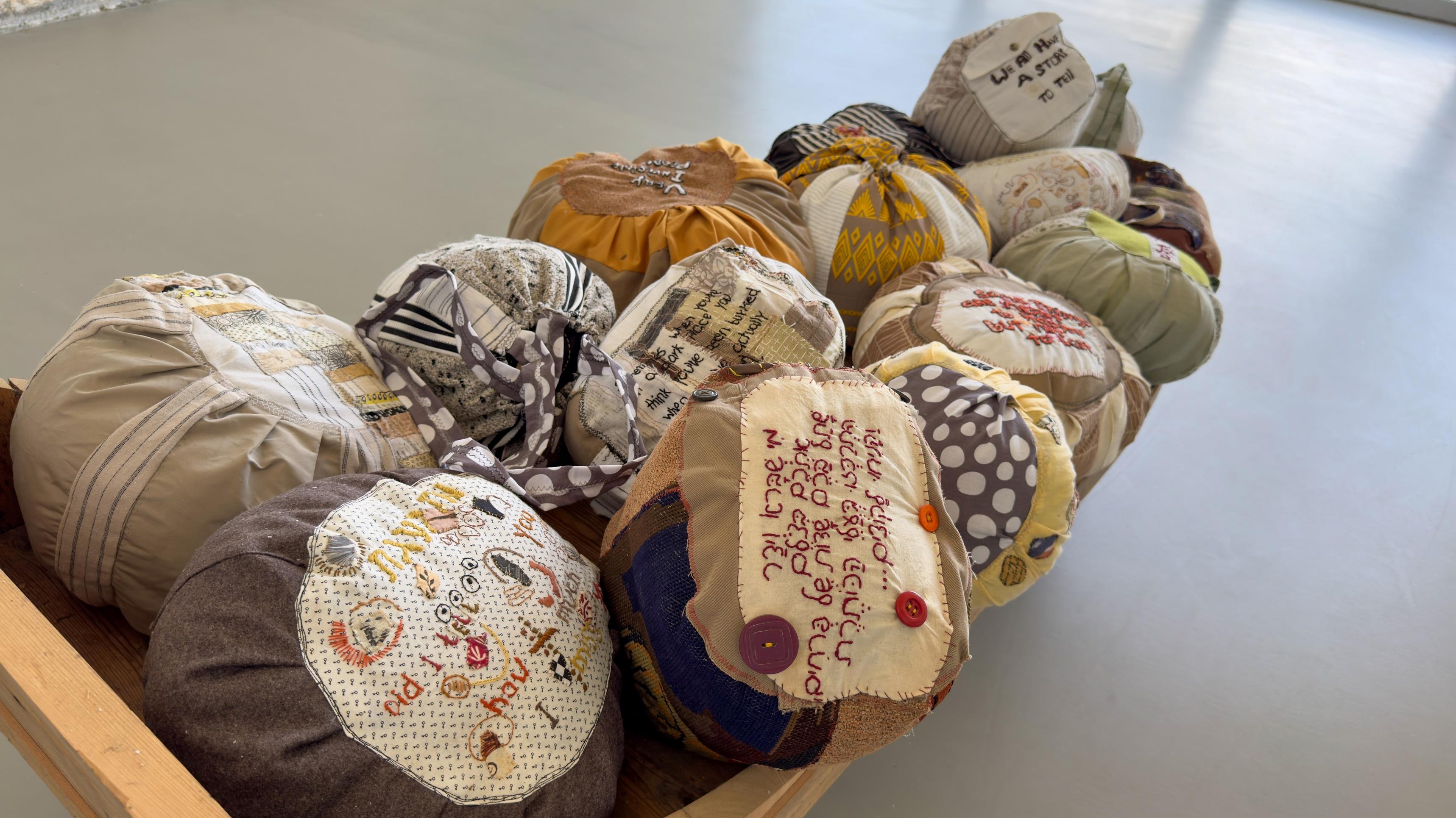 During this painful and complex period, I would like to invite you to hone your attention as you enter this unique space; to approach the works and experience the sense of peacefulness and nuanced temporal quality embedded in the craft of embroidery; to direct your gaze into the distance, towards the landscape and wide-open sky, and then back again to the drawings and abstract forms appearing on the rear side of the works; to weave and unravel thoughts, as a conscious, potentially healing act.