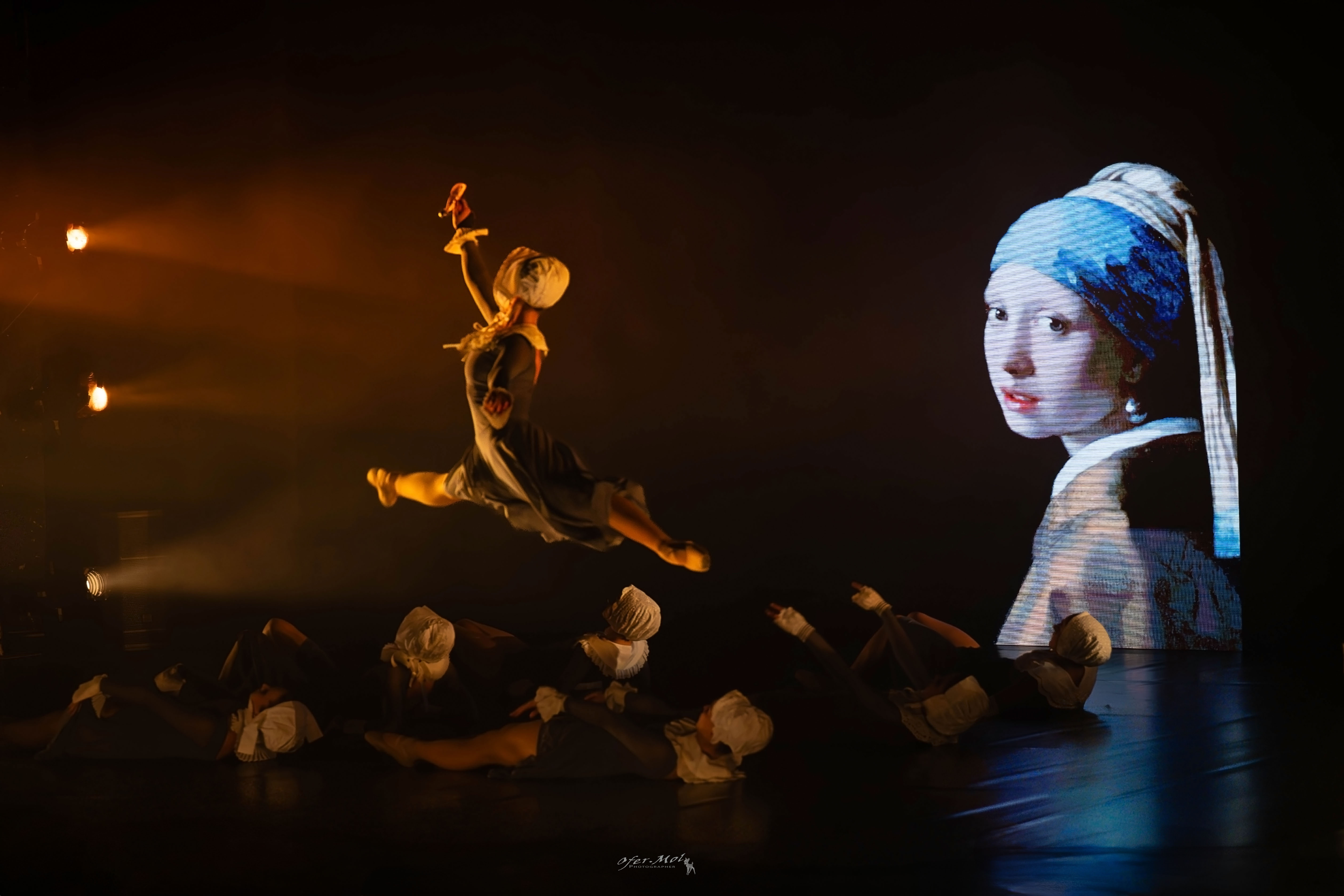 The doll wanders through a world at once familiar and strange. In the Netherlands, girls in bonnets and heavy wooden clogs tap out dances to “The Syncopated Clock.” The scene is funny, playful, and delightfully absurd. Flowers bloom across the stage; Dutch paintings flicker on the screen; Van Gogh himself appears at the footlights with a bouquet of sunflowers. The dancers turn to face the audience, and each spectator sees something different: a red-light district, a field of tulips, a gallery where brushes become feet and paint turns into rhythm. Kafkaesque absurdity thickens. Dancers crawl across the stage with chairs strapped to their backs, forming a circle; Kafka ends up at its center, resting on the legs of his beloved beetles (though who can say for sure what Gregor Samsa really became?). The beetles flip the chairs upside down; letters appear on them, forming words and entire cities.