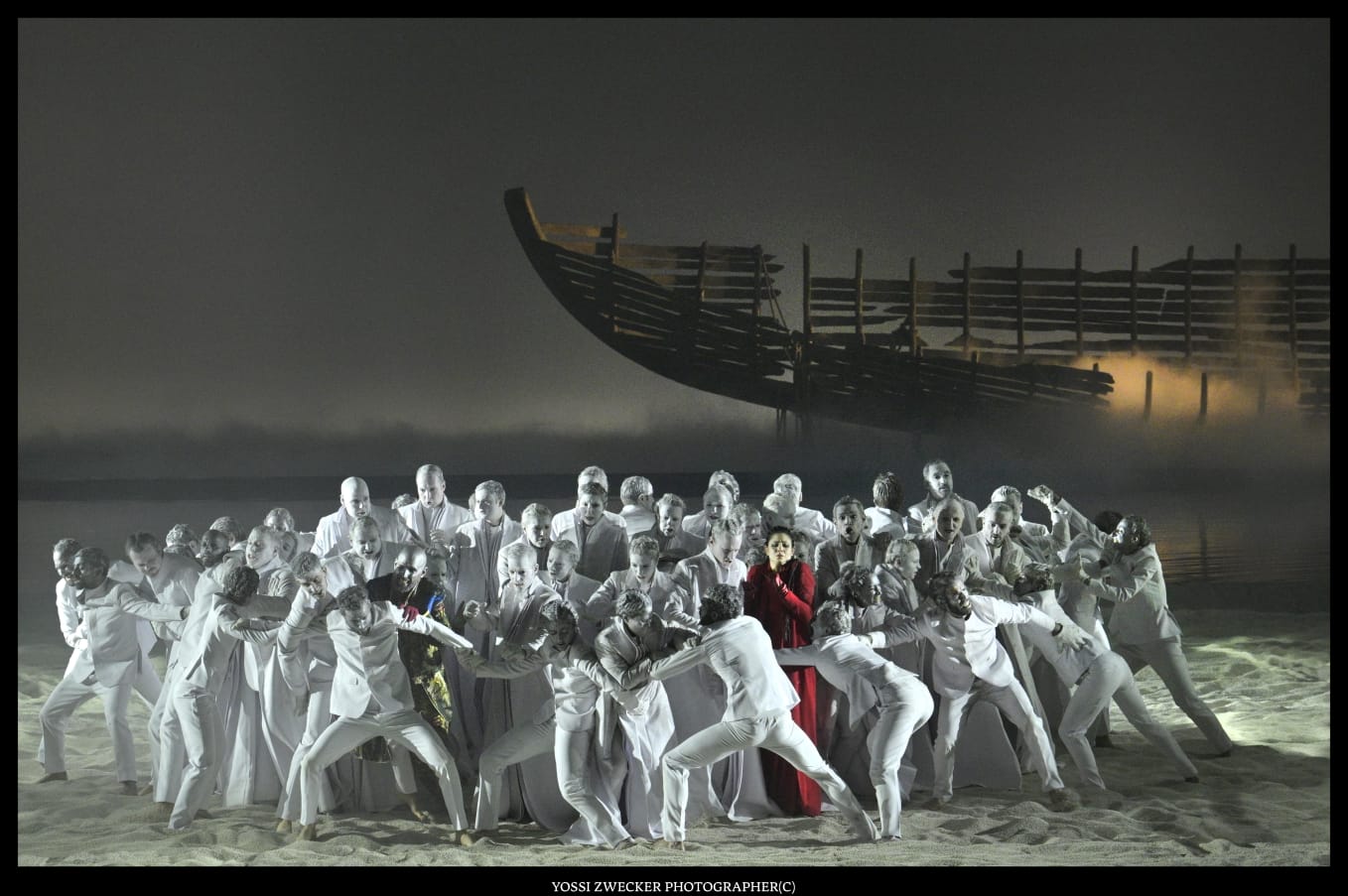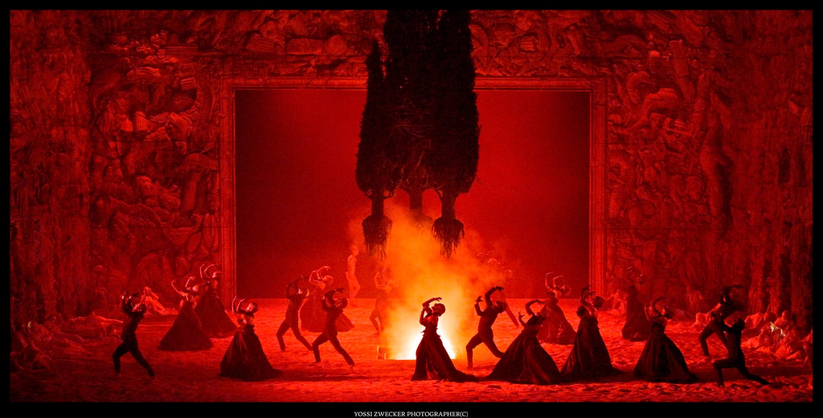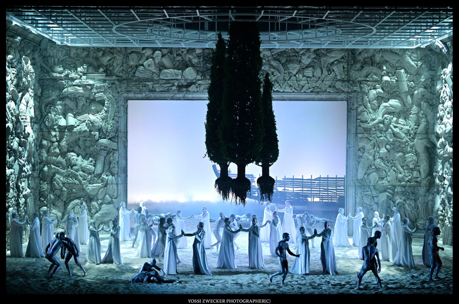 За исторически информированное исполнительство в опере Пёрселла отвечает израильский оркестр барочной музыки «Barrocade», играющий на виолах да гамба и д’амур, виолоне, лютне, псалтерионе, теорбе, барочной гитаре, деревянных гобоях, нехроматической трубе и множестве дивных ударных инструментов (один эолифон чего стоит), способных воссоздать любой существующий в природе шум. Для современного уха «натуральная» медь кажется поначалу интонационно неточной, но вскоре вы осознаете всю ее прелесть. Пожалуй, даже нерафинированные эстеты оценят и мастерски отыгранное изобилие мелизматики во всех оркестровых голосах, и идеально переданную звукоизобразительность, в особенности завывание ветра в сцене бури. Управляет музыкальной стороной действа Герд Амелунг, коему внятны и английское оперное барокко, и эмоциональные формулы барокко итальянского. Дидону по (укоренившейся, в отличие от кипарисов) традиции поет меццо-сопрано Анат Чарны, которая оказывается на удивление опытной мастерицей барочного вокала; ее чувственный, слегка темноватый голос звучит искренне, без надрыва – и тем отличается от звонких товарок-сопрано, коим чаще всего поручают партию заглавной героини. Баритон Одед Райх величаво изображает Энея, но не по-барочному, а очень присутственно, заставляя вспомнить ахматовское «Ромео не было, Эней, конечно, был». Cопрано Даниэла Скорка – очень живая, с чистым, звонким тембром – очаровательна в партии Белинды, контральто Шай Блох демонична в образе Колдуньи, да и прочие компримарио живописно-убедительны. Абсолютно чудесен хор, особенно отпевание Дидоны в последней сцене «With drooping wings ye Cupids come, And scatter roses on her tomb…» Оркестр тоже хорош, собран, гибок, дышит фразой. Герд Амелунг ведет спектакль без лишней барочной тяжеловесности, сохраняя чистый пёрселловский нерв.