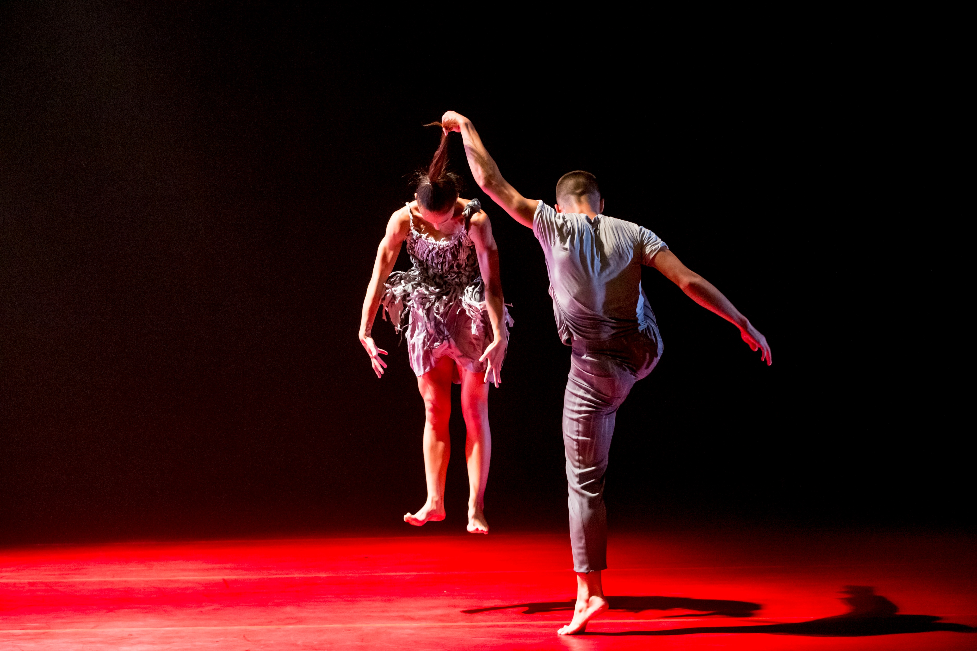 Здесь и партнерство начинается там, где опора отменена. Особенно остро это проявляется в одном из дуэтов, где танцовщик буквально таскает партнершу за волосы, отрывая ее от земли. Жест предельно рискованный: нет привычной системы поддержки, нет распределения веса, нет «безопасной» кинестетической логики. Волосы становятся точкой контакта, а значит – точкой абсолютной уязвимости.