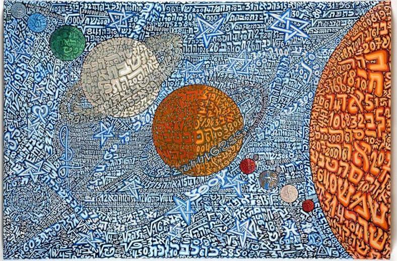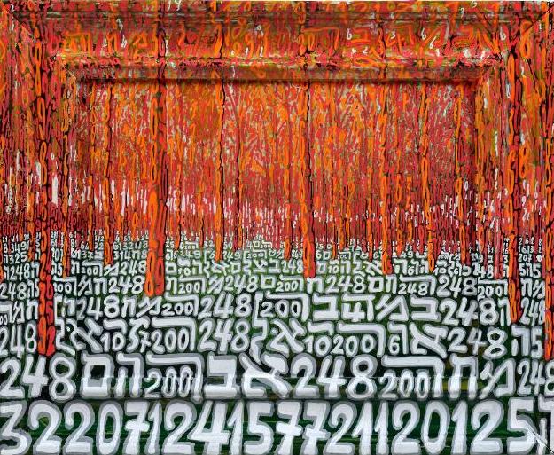 Во имя высоких духоносных целей Тобиа Рава заботливо, как ребенка одеялом, покрывает все свои работы цифрами и буквами еврейского алфавита. Поясняя, что тем самым он призывает пересмотреть связь между человеком и его окружением через визуальную конверсию гематрии. Иначе – еврейской нумерологии. А именно, метода, который позволяет найти тайные соответствия между словами с помощью численного значения букв, их составляющих. По словам художника, все его работы так или иначе выявляют архетипические элементы еврейской культуры – основанные на буквенно-цифровых последовательностях, они отсылают к универсальному космологическому языку.