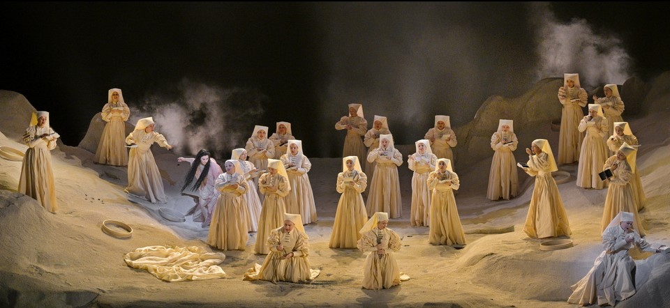 В чайковской «Иоланте», чья премьера состоялась сегодня в Израильской опере, слепота – свет, а прозрение – тьма. Декорация – пустыня вместо цветущего сада, песчаные барханы, девушки просеивают песок сквозь сита, всё залито молочно-белым, стерильным, почти утробным светом. Юноши – сплошь альбиносы, ибо мир, созданный режиссером Ширит Ли Вайс и сценографом Адамом Келлером, – мир без пигмента, без контраста, без различий. Незрячий в данном контексте – значит «чистый», «неиспорченный».