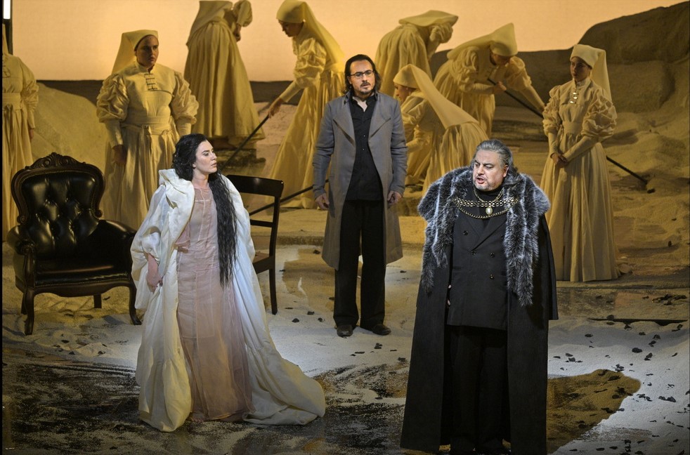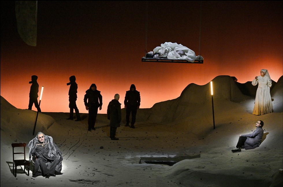 На самом деле, где-то минут через десять после начала спектакля у меня возникли совершенно другие ассоциации. Невольно вспомнился фильм The Father Флориана Зеллера с Энтони Хопкинсом, где мир показан изнутри распадающегося сознания: бесцветного, зыбкого, лишенного устойчивых ориентиров. Реальность там не объективна – она субъективна, искажена, проживается изнутри болезни (герой, если помните, страдает деменцией). Если следовать этой логике, можно предположить, что режиссер Ширит Ли Вайс выстраивает начало «Иоланты» не как внешний мир, а как перцептивное поле самой героини. Песок, монохромность, отсутствие контрастов – не эстетика, а зрительное воображение слепоты, мир «глазами» Иоланты, еще не знающей, что значит видеть. В этом ключе финальная тьма обретает иную, хотя и не менее тревожную логику: прозрение не приносит немедленного света, а обрушивает хаос. После ровной, безопасной серости приходят резкость, страх, фрагментарность – и потребность ухватиться за крошечные источники смысла, за фонарики, за молитву. Да за какую – «Прими хвалу рабов смиренных! Во прахе мы перед Тобой!»