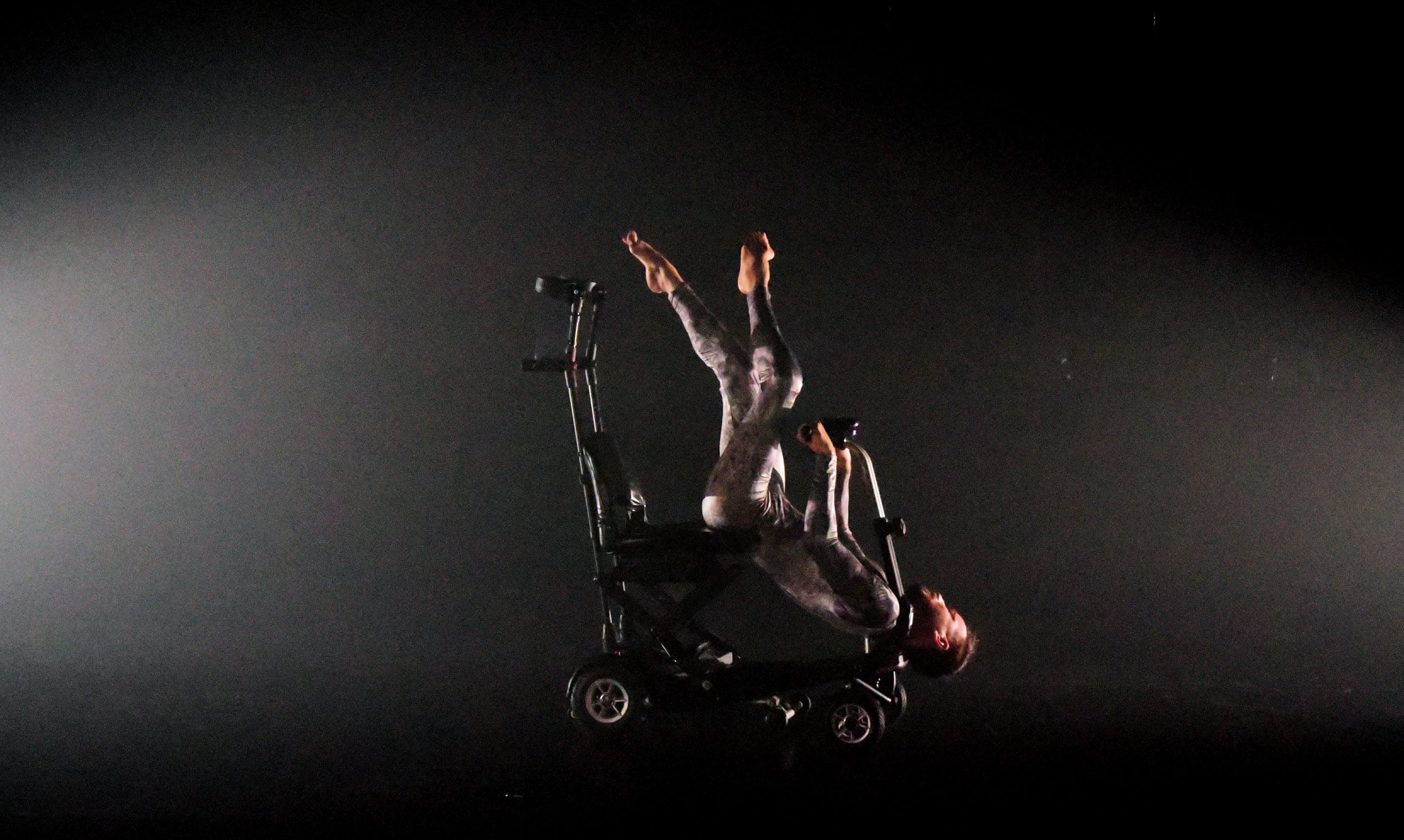All the while, an empty wheelchair circles the stage. It feels like a record of another coordinate system, one in which the body was once described differently. It becomes a kind of third presence—silent, insistent, stripped of dramatic emphasis. Simply an object continuing its motion, even though the body has long since moved beyond it.
