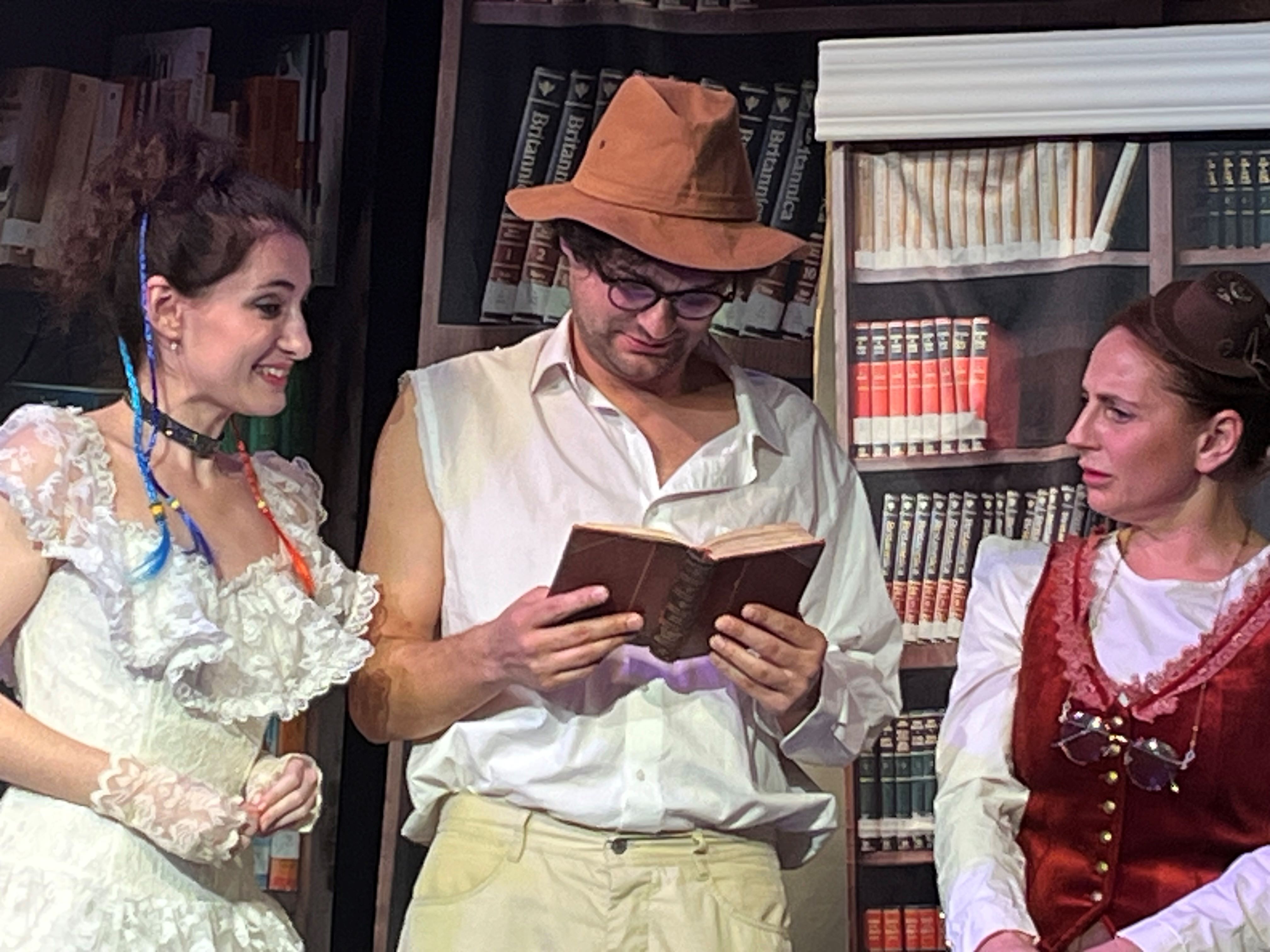 Тем не менее, спектакль очень современный, и костюмы современные и дивные абсолютно (автор всего – Ариэль Крыжопольский in propria persona; всего – кроме музыки). Оттого и книги в его библиотеке, и каталожные карточки, которые вроде бы дышат пылью веков, начинают говорить сегодняшними голосами. И если принять за аксиому, что государство тут – собрание текстов, или архив, или книга, которую можно перелистнуть, а можно переписать, то все эти тексты каким-то образом выстраиваются в немую вертикаль власти, а персонажи ходят между ними, словно между версиями правды/кривды.