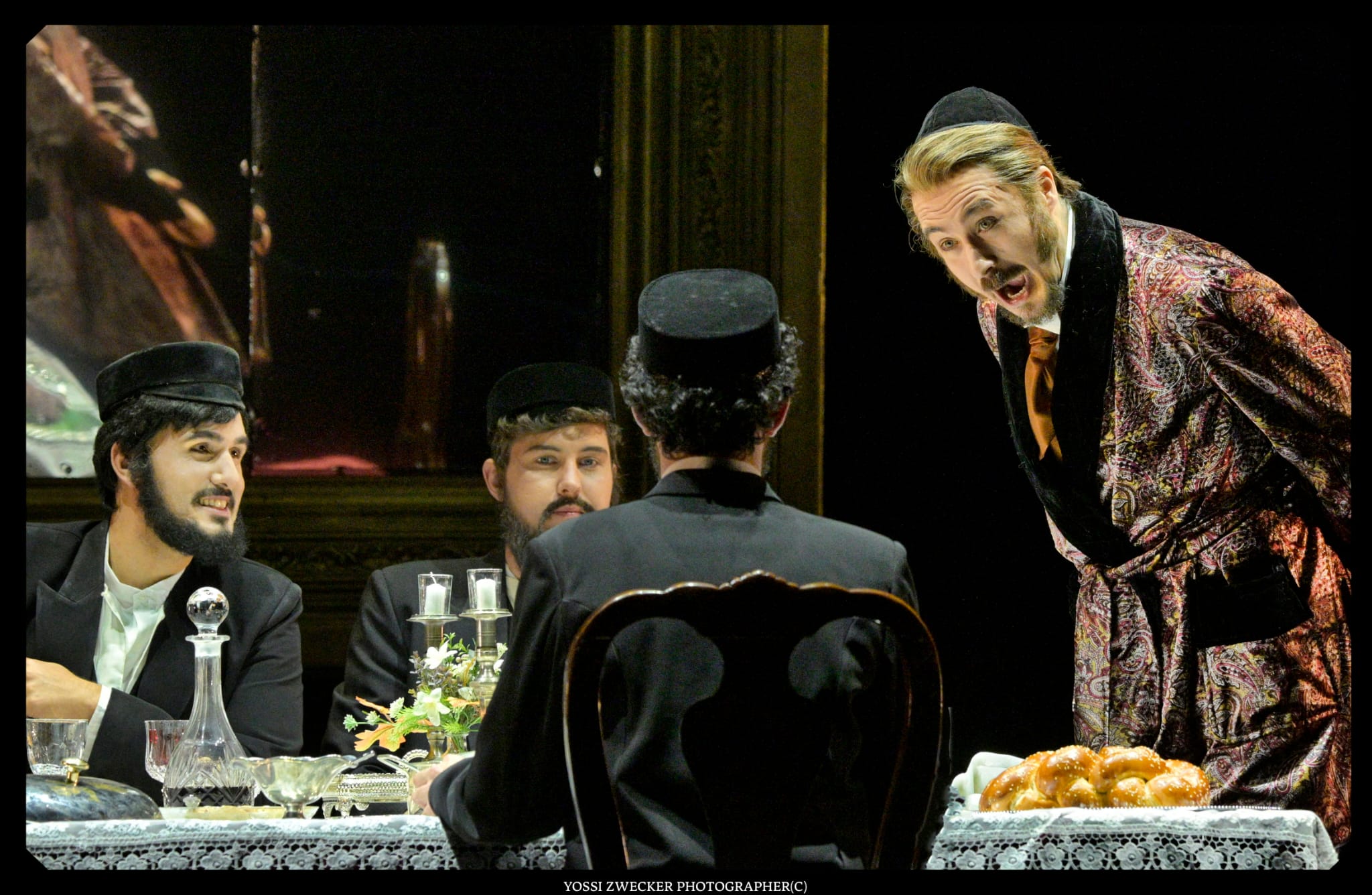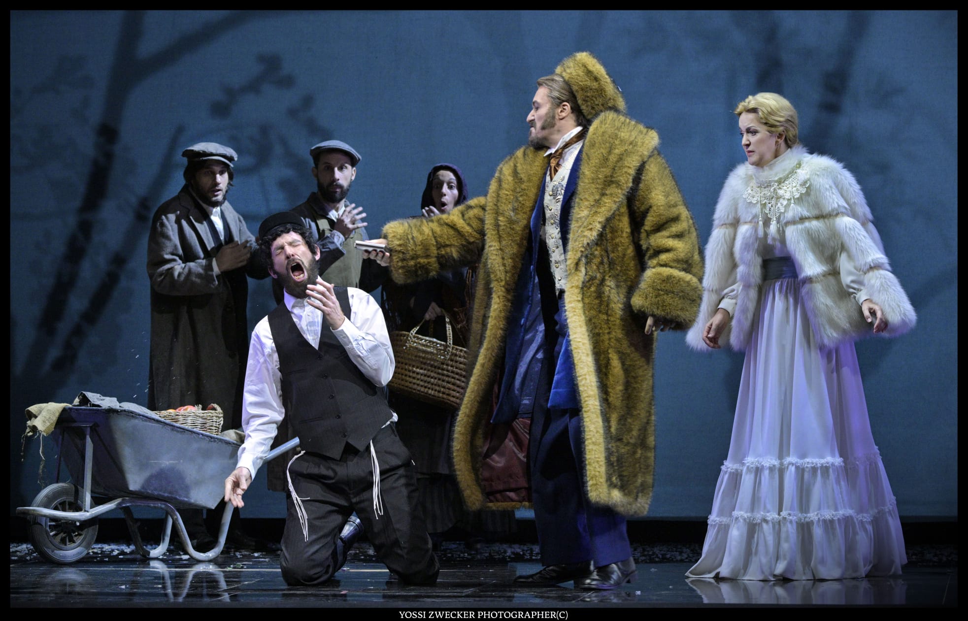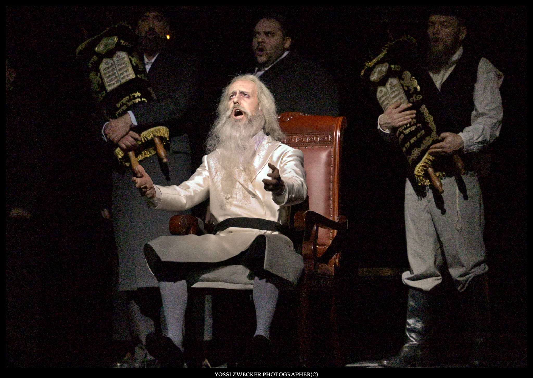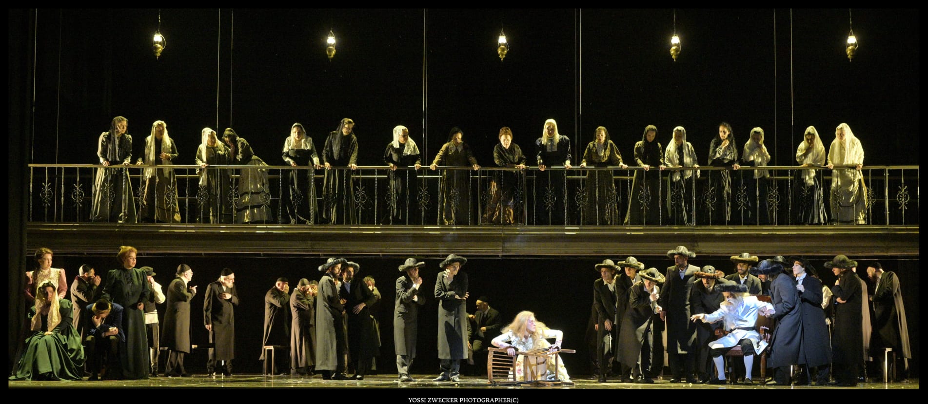 Все певцы – израильские, и все поют на диво хорошо. Прекрасный баритон Йонуц Паску в образе Сендера, отца Леи, неизменно привлекает внимание. Еще один баритон Одед Райх дивно звучит в партии Ханана. Третий баритон Яир Полищук изображает Цадика, который еле волочит ноги – дивная работа во всех смыслах. Великолепная Яэль Левита (сопрано) создает незабываемый вокальный и драматический образ Нищенки, особы крайне вредной и вообще-то ведьмы. И моя любимица Тамара Навот (меццо-сопрано) органична в образе Батьи, и Рона Шрира (контральто) – в образе служанки Фриды, и Эфрат Барам Акоэн (сопрано) в роли Гител.