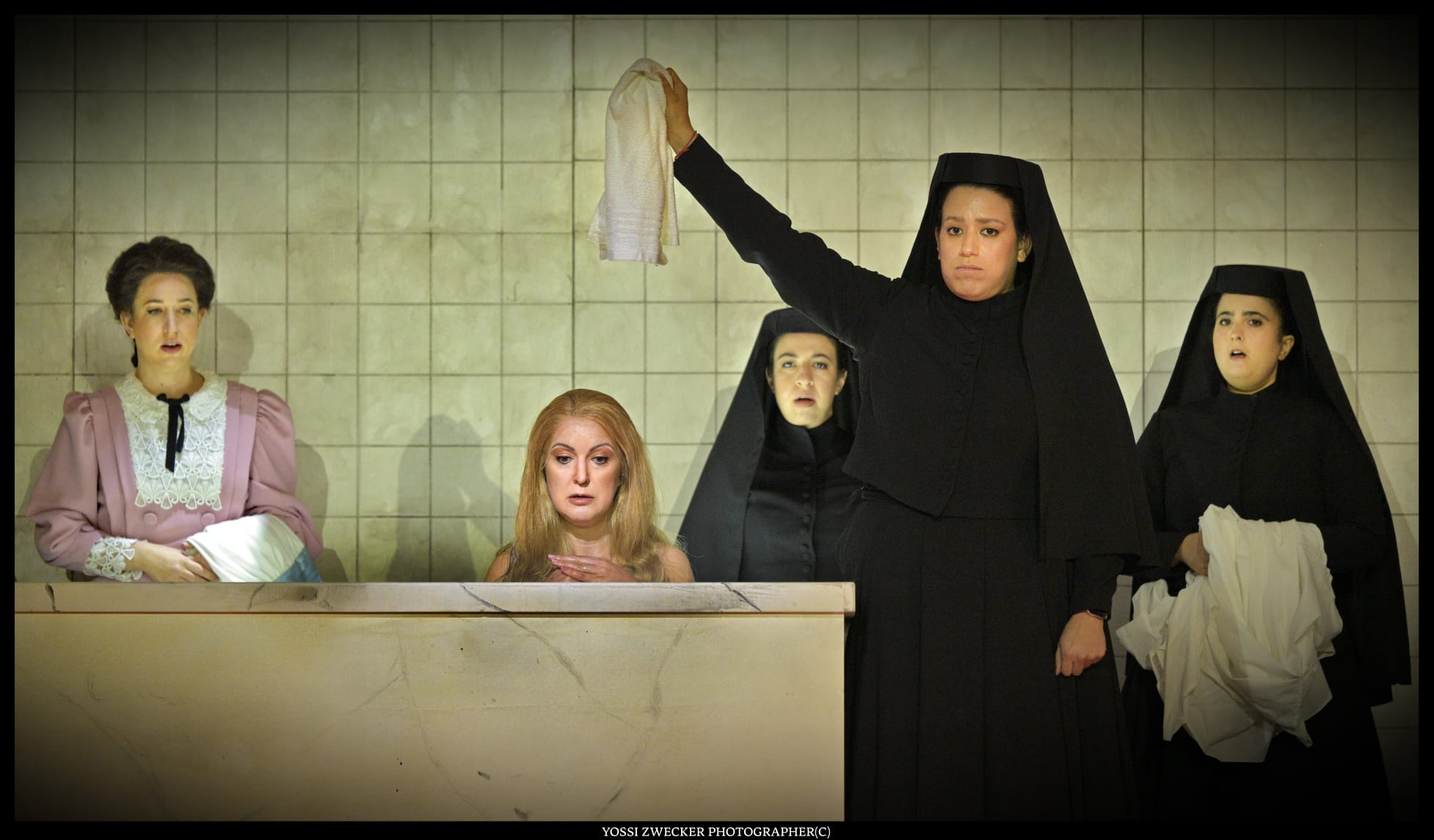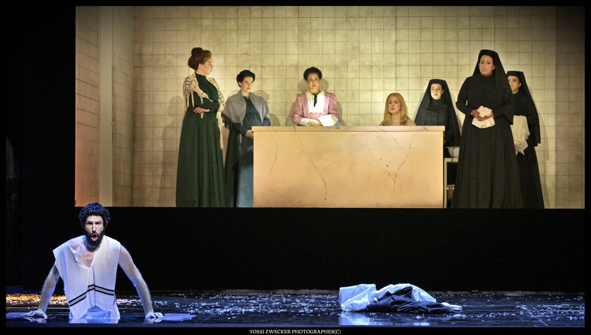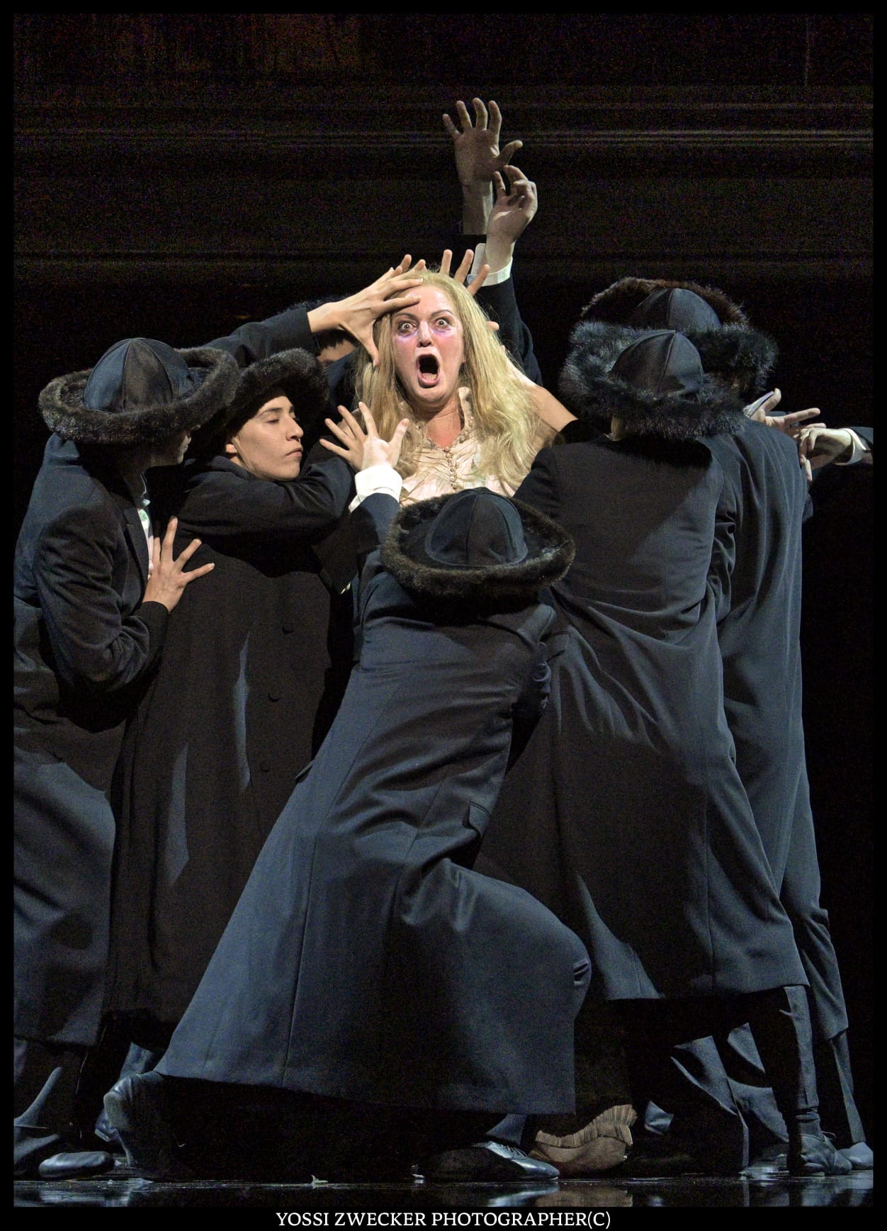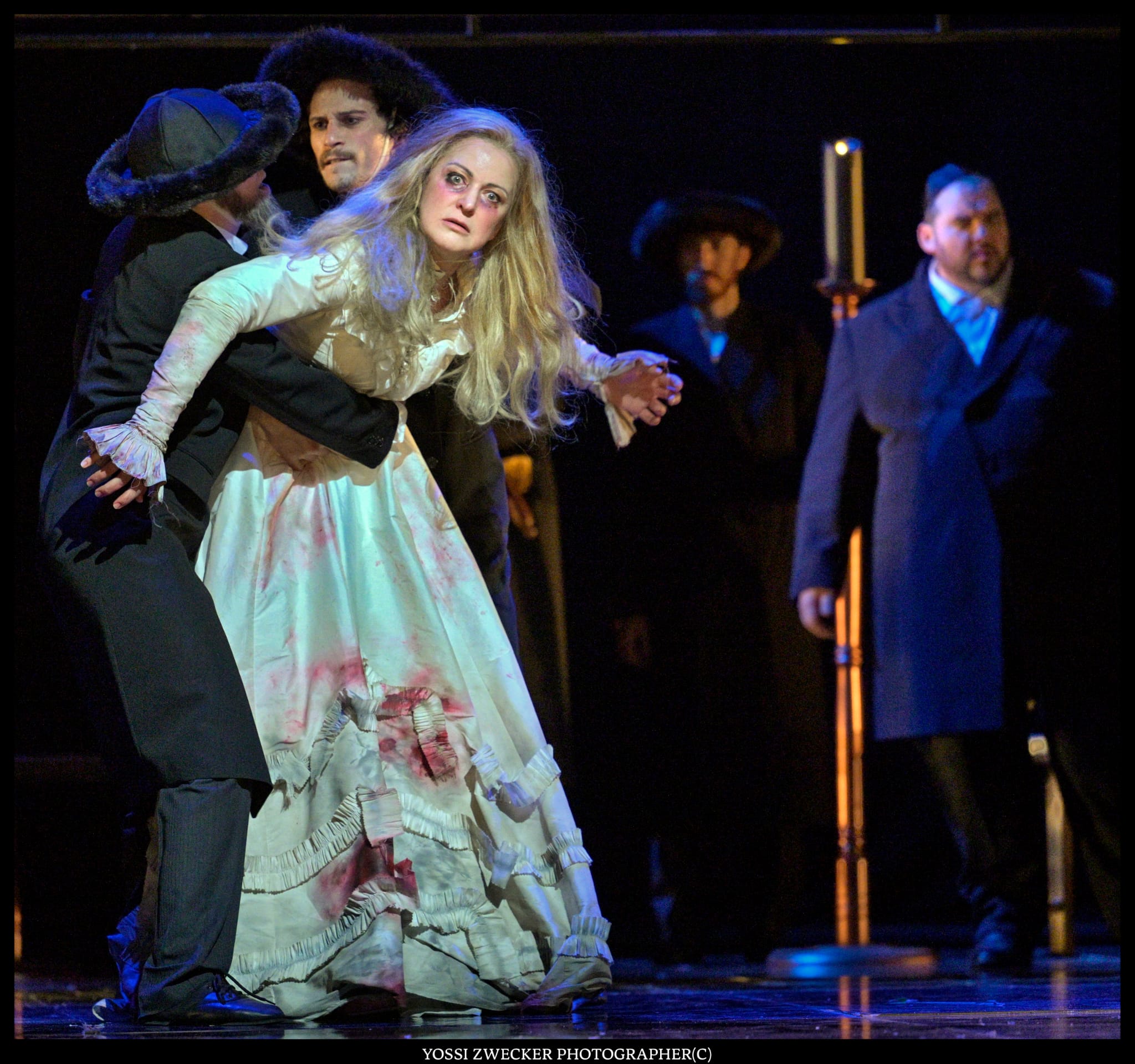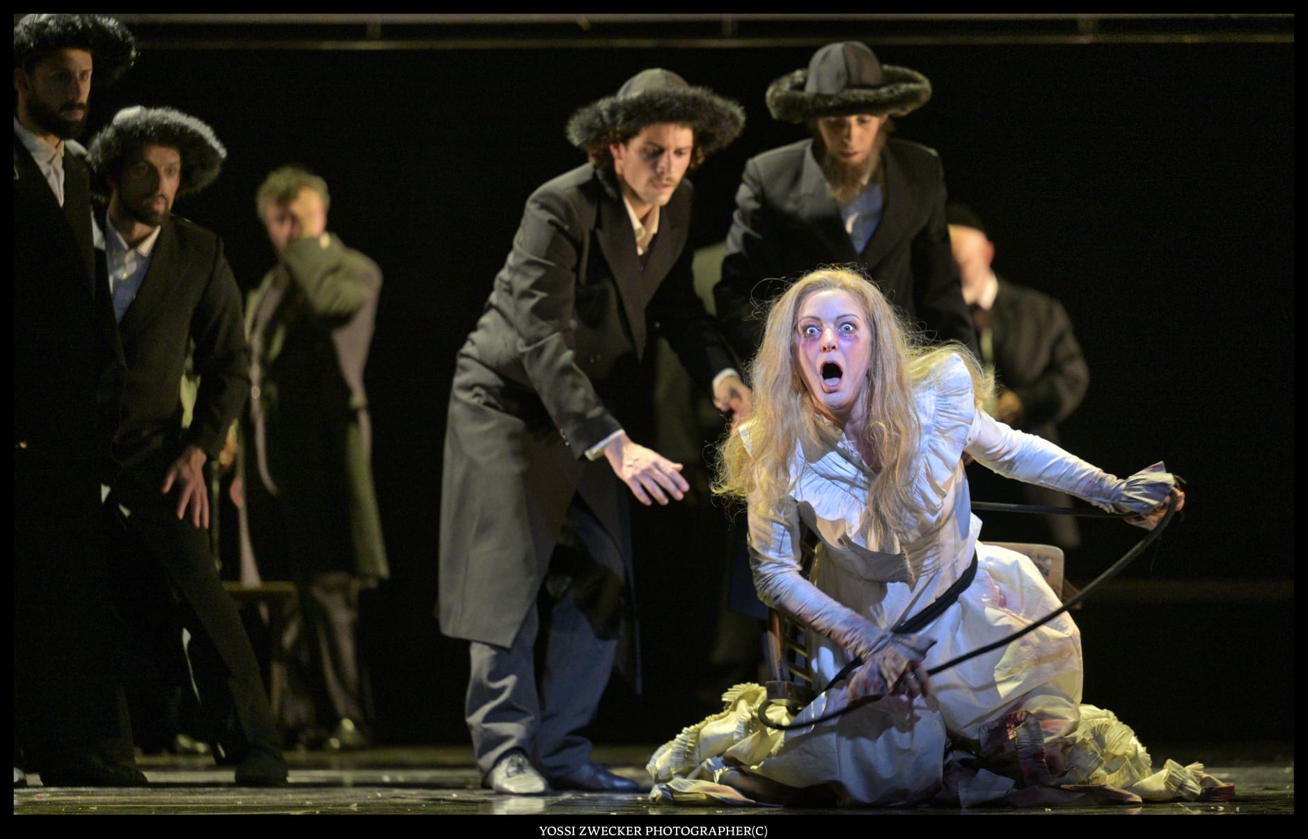 Все певцы – израильские, и все поют на диво хорошо. Прекрасный баритон Йонуц Паску в образе Сендера, отца Леи, неизменно привлекает внимание. Еще один баритон Одед Райх дивно звучит в партии Ханана. Третий баритон Яир Полищук изображает Цадика, который еле волочит ноги – дивная работа во всех смыслах. Великолепная Яэль Левита (сопрано) создает незабываемый вокальный и драматический образ Нищенки, особы крайне вредной и вообще-то ведьмы. И моя любимица Тамара Навот (меццо-сопрано) органична в образе Батьи, и Рона Шрира (контральто) – в образе служанки Фриды, и Эфрат Барам Акоэн (сопрано) в роли Гител.