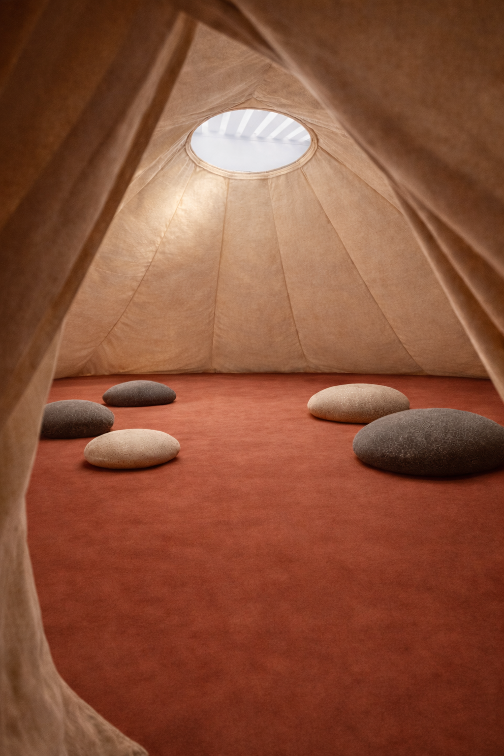 Noga Or-Yam’s sound installation, Reviving, is concealed within a temporary tent. It offers an intimate space for being while listening to a frank dialogue with her father and engaging in an inner meditative practice.