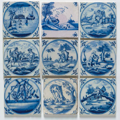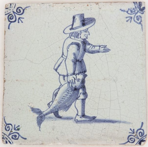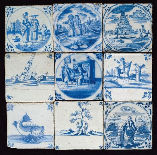 Китайский фарфор повлиял на стиль росписи дельфтского, прямыми прародителями которого стали фламандская красноватая плитка и испанско-итальянская расписная майолика 15 века. Первые изразцы были разноцветными, а потом мастера стали рисовать синим на белом, изображая в кальвинистском восприятии библейские сюжеты (Давид, с мечом в три раза его большим – знаете, почему?), морские корабли и волны, навигационные инструменты и пейзажи, батальные сцены и модниц, ремесленников (особенно хорош мышелов) и играющих в скакалочку и мяч детей. Актуалии тех времен – чудища и виселицы – также не забыты, равно как и бытовые сценки, коровы, мельницы и цветы. Отдельный стенд – изразцы из коллекции Арье Ароха, еще один стенд – испорченные, «подплавленные» изразцы, обожженные при неправильно установленной температуре печи: кобальт рисунка «поплыл», и эти преимпрессионистские квадратики, случайно не выброшенный брак, стали ценными экспонатами.