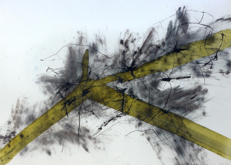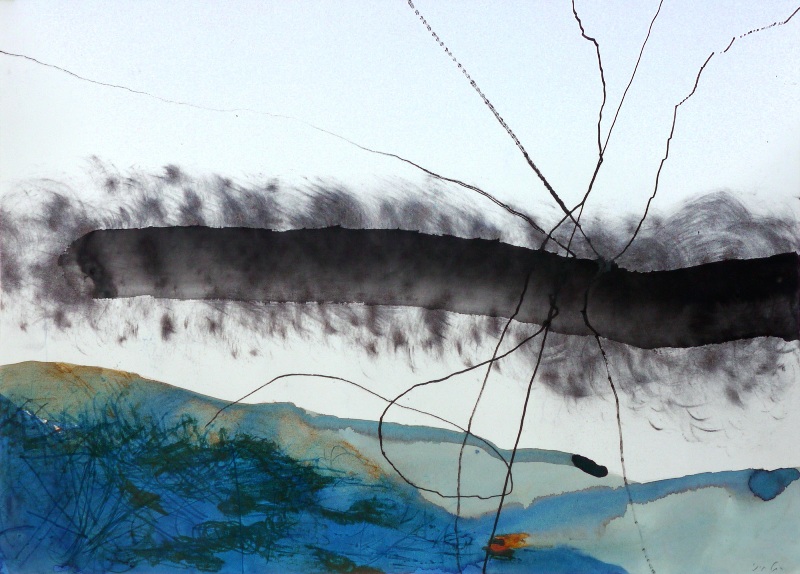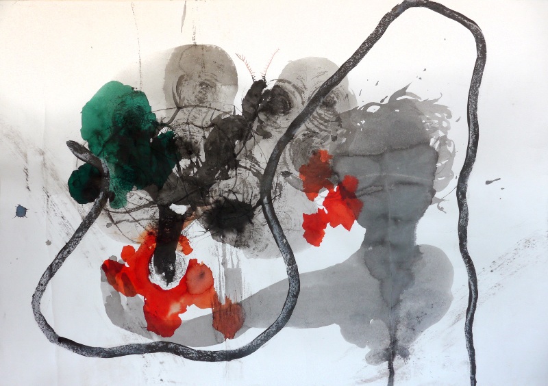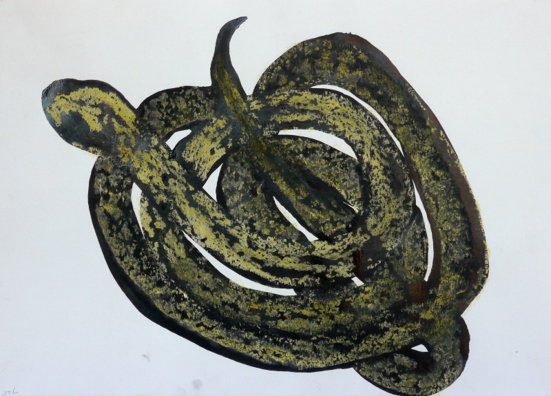 В серии работ «Змея – это первая линия» Кини пытается вернуться к азам рисунка, к моменту возникновения формы, сохраняя при этом потенциал изображения и избегая его фиксации. Из акварели в акварель путешествуют всего несколько повторяющихся образов, ибо Рахель стремится к сжатию нарратива до минимума, к внятной простоте «говорящего» материала. К примеру, обгоревшая ветка дерева, подобранная ею в лесу, – это уголь; пятна – это лужи, оставляющие водянистые следы; линия – это змея, или вена, или трещина.