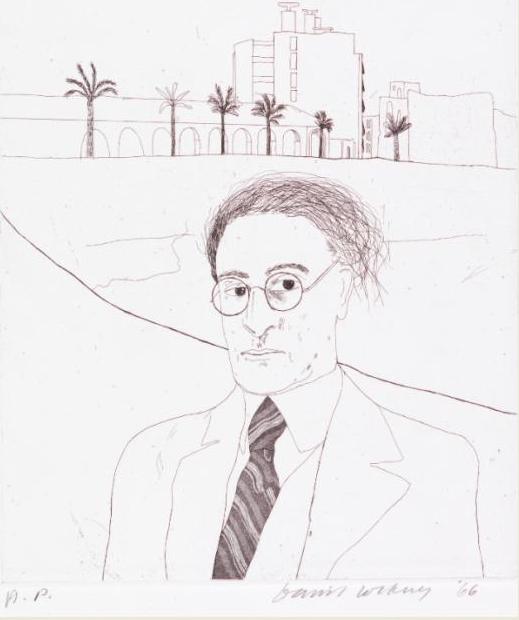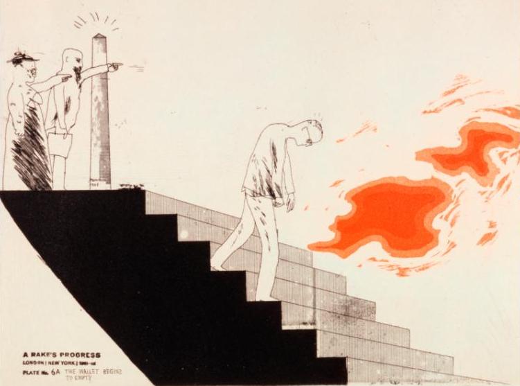 Серия из 16 офортов «Похождения повесы в Нью-Йорке» (1961-63) навеяна сразу двумя источниками: серией гравюр 1735 года «Похождения повесы» (A Rake's Progress) Уильяма Хогарта, английского художника и теоретика искусства эпохи Просвещения – и одноименной оперой Игоря Стравинского 1951 года, вдохновленной упомянутыми гравюрами (над либретто, между прочим, потрудился не менее великий английский поэт Уистен Хью Оден). Изображается здесь жизнь богатого наследника Тома Рэйкуэлла, который, промотав отцовское состояние и не желая следовать примеру унылой добродетели родителя, вкушает прелести столичной лондонской жизни – да так рьяно, что заканчивает свои дни в Бедламе, то бишь приюте для умалишенных. Самое занятное, что этот сюжет о попусту растраченной жизни Хокни превратил в автопортрет, поведав о своем собственном опыте в Нью-Йорке. Получился полуавтобиографический рассказ о том, как в 1961 году он отправился в город Большого Яблока и окунулся в сладкую атмосферу порока. Он продает свои принты, снискав расположение «добрых людей», осветляет волосы, регулярно посещает бары и даже женится. Стихийные бедствия начнутся, как только его деньги иссякнут, и «добрые люди» начнут его избегать. И тогда его поглотит безликая толпа, и наступит безумие. Оттого на офортах «Похождения повесы в Нью-Йорке» блудный сын Хогарта-Стравинского похож на самого Хокни: трогательный незадачливый очкарик-провинциал, затерявшийся в дебрях мегаполиса.