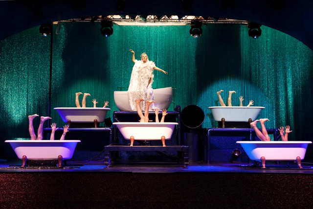 Между тем, берлинский аттракцион SOAP – это вовсе не мыльная опера; это блестящий гибрид фриндж-театра, contemporary dance, цирка и кабаре. Ну и оперы, как же без нее. Divine diva – дивная оперная певица Патрисия Хольцманн, что явится Венерой из банной пены – споет вам и Генделя, и Моцарта, и Штрауса, и даже «Битлз». Разве что моцартовская The Magic Flute трансформируется в The Magic Splash, штраусовский The Blue Danub – в The Blue Dantub, а битлы примутся заверять вас, что All You Need is Splash.