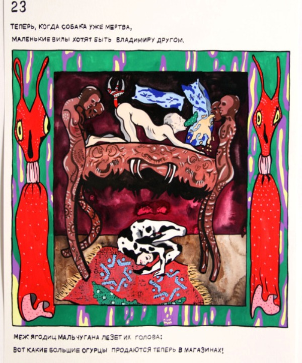 Правда, Комара-Мышкина никогда не существовало, ибо под этим псевдонимом скрывался Ефим Поплавский, поэт и художник, родившийся в Москве в 1978-м, репатриировавшийся в Израиль в 2003-м и сведший счеты с жизнью в 2011-м. Поплавского, кстати, не существовало тоже, ибо это очередное розеновское alter ego, причем параноидальное. Ego полагало, что его хочет убить Владимир Путин, оттого перед суицидом составило завещание в виде книжицы с рисунками «Ночь Владимира». Книжица эта – затейливо перетолкованный «Мойдодыр», где вокруг лежащего в постельке Путина оживают все предметы и в конце сказки вроде бы его убивают.