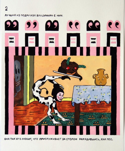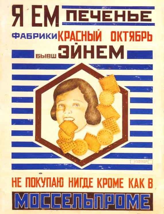 Надо признать, Розен страшно проникся российскими реалиями и как следует в них разобрался. Алина Кабаева, изогнувшаяся, как на известной фотографии, обратилась в собачку – белую в черную крапинку, возлежащую на коврике возле владимировой кроватки. Душа Владимира инкарнируется не в бабочку, как это принято в русском фольклоре, а в мохнатого кровососа, помесь комара с мышью (ну и кто здесь Комар-Мышкин?). На каждой странице книжицы – очень графичной и очень декоративной – узнаются и русские конструктивисты, и фрески Андрея Рублева, и альбомы московских концептуалистов Кабакова и Пивоварова, и советский бытовой плакат, и рекламные шедевры Родченко с Маяковским. К примеру, конструкт идеального младенца, которому в рот влезает печенье: «Я ем печенье фабрики «Красный Октябрь», бывшей Эйнем. Не покупаю нигде, кроме как в Моссельпроме».