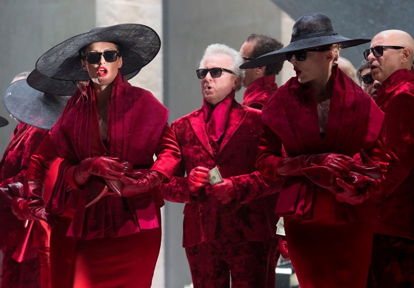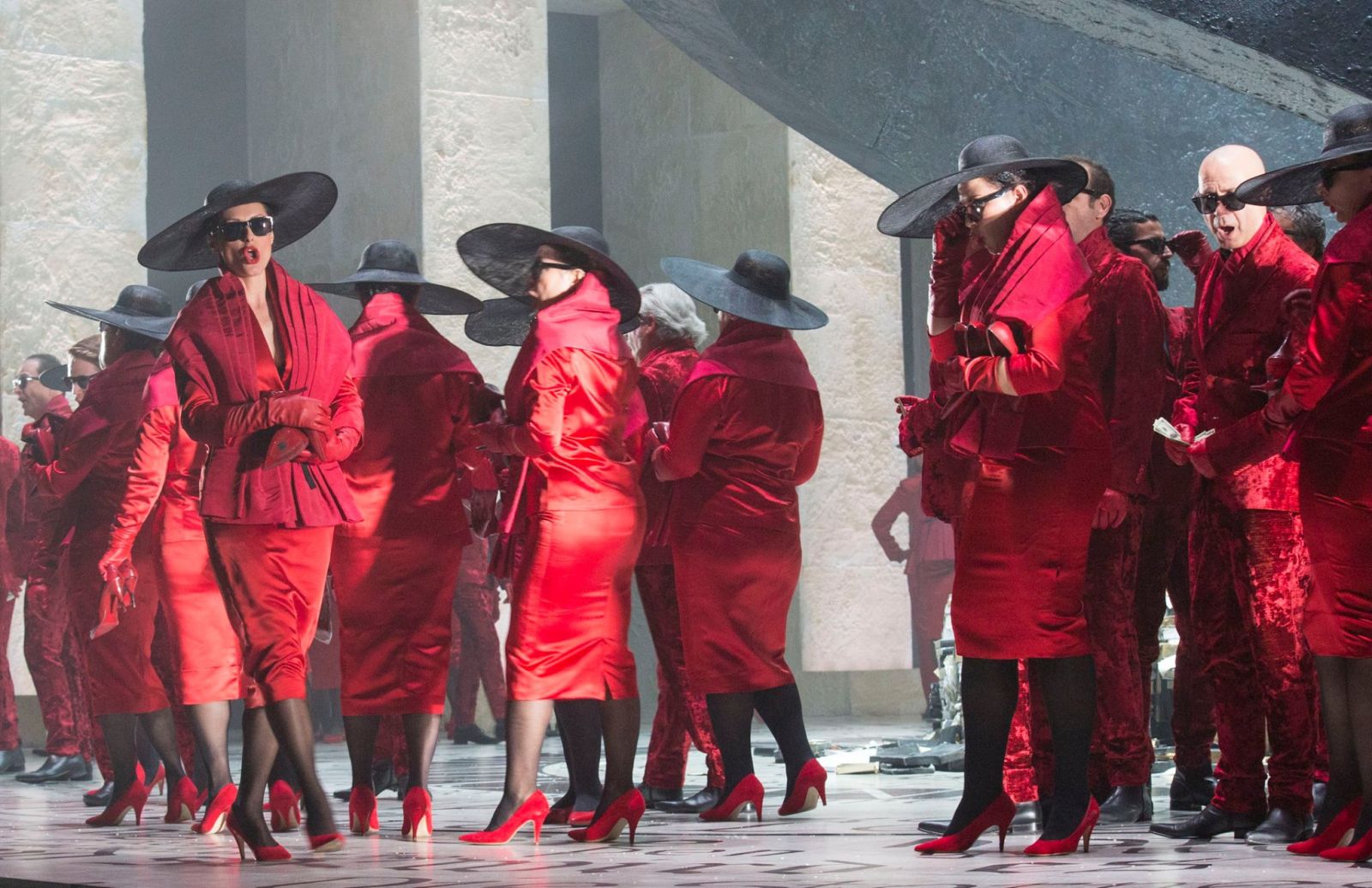 «Люди разных каст и стран пляшут в круге бесконечном». Круг – вот он, непрерывно движется, становится то отрезком времени, то дырой в ходе времени, то пирсом, с которого уходят в бессмысленное плавание по морям войны солдаты, то оградой сада, то церковью. Алые атласные, деланно-доминирующие костюмы мужчин и женщин – это тоже высказывание режиссера-мыслителя, на которого лавиной идут истошные крики подиумов, приказы агрессивной рекламы. Хор и миманс так удачно высмеивают и пародируют модные парады, так поглощены своей модной одеждой, модными трендами, модными очками, что невольно хочется просто схватиться за Гете, вспомнить о душе, перевести дух...